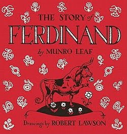 I remember my mother reading THE STORY OF FERDINAND to me when I was child. I don’t know what is really is that stuck with beyond the idea of a bull sitting and smelling the flowers. When I was in high school I took a child development class. For one of the days we actually got together in groups and taught the children in the day care. Each group was assigned a nursery rhyme and everything we did had to revolve around it. My group had Hey Diddle, Diddle. My job was to come up with a story that could be tied in. I came up with FERDINAND.THE STORY OF FERDINAND is by Munro Leaf. It was written in 1936 and has been published around the world at this point. It is a cute little picture book about a bull named Ferdinand. Ferdinand isn’t a normal bull who likes to frolic in the grass, but he likes to sit under a tree and smell the flowers. When he grows up all of the other bulls dreams of going to the bull fighting rings in Madrid. Ferdinand likes to smell the flowers. When he is chosen to go to the bull fights none of the spectators are ready for what happens.